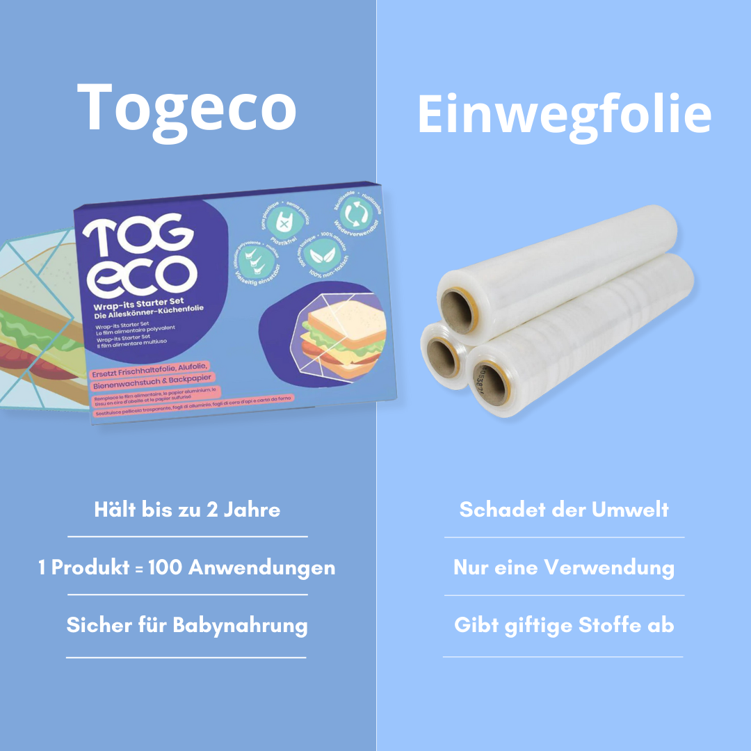 Die gute Nachricht: Mit den Togeco Wrap-Its gehören diese Probleme der Vergangenheit an. Unsere Wrap-Its sind robust, wiederverwendbar und so einfach zu handhaben. Sie sind deine verlässliche, plastikfreie Alternative, die dir hilft, Zeit, Nerven und Geld zu sparen.